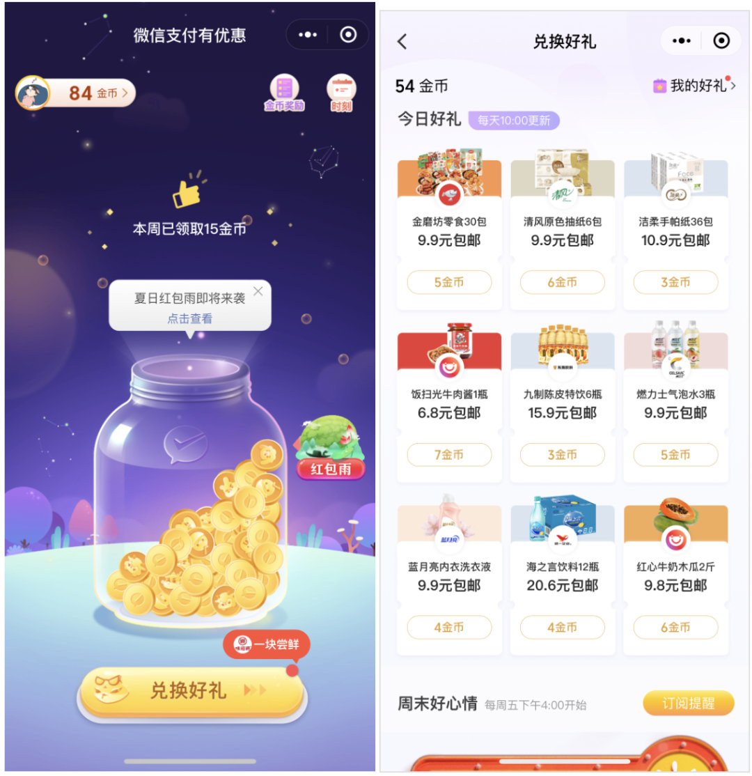 2020年,微信推出“微信支付有优惠”官方小程序,作为微信官方的一站式权益平台,用户可以通过微信支付后领取金币,再用金币兑换品牌券的方式,提供年轻群体(大学生、初入职场)充分且精准的品牌福利,提升用户的价值认同感。