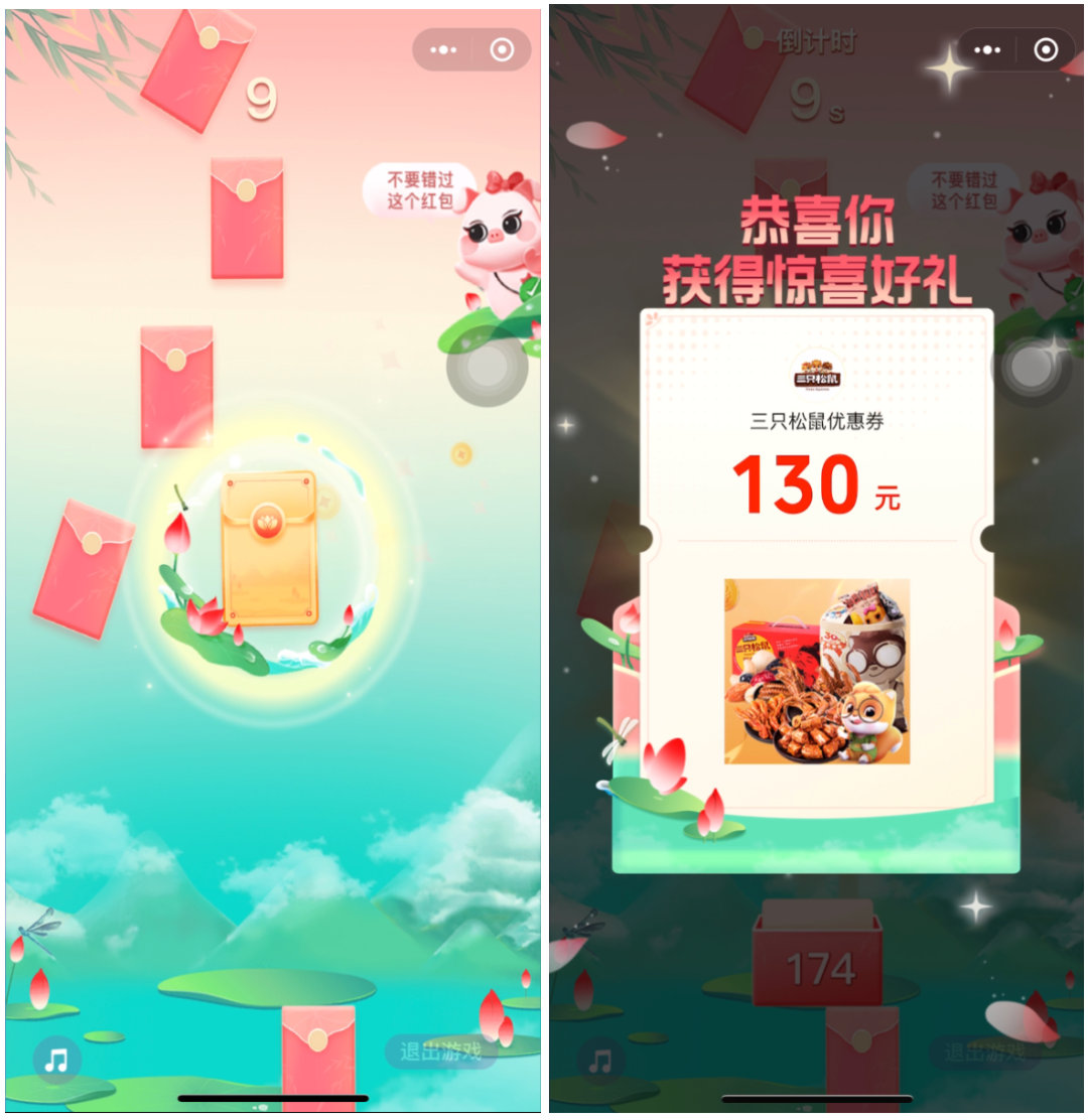 今年7月18日-20日,微信支付有优惠发起一年一度的夏日红包雨活动,三只松鼠就打了一个漂亮的开场,活动开始后的1个小时内就为三只松鼠的商城小程序带来了几万用户,且90%都是新客,提供了互补性非常强的私域导入通道。