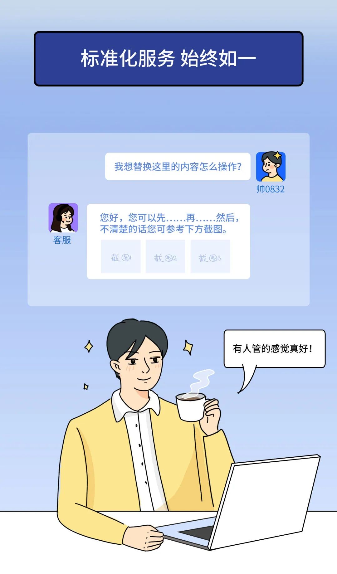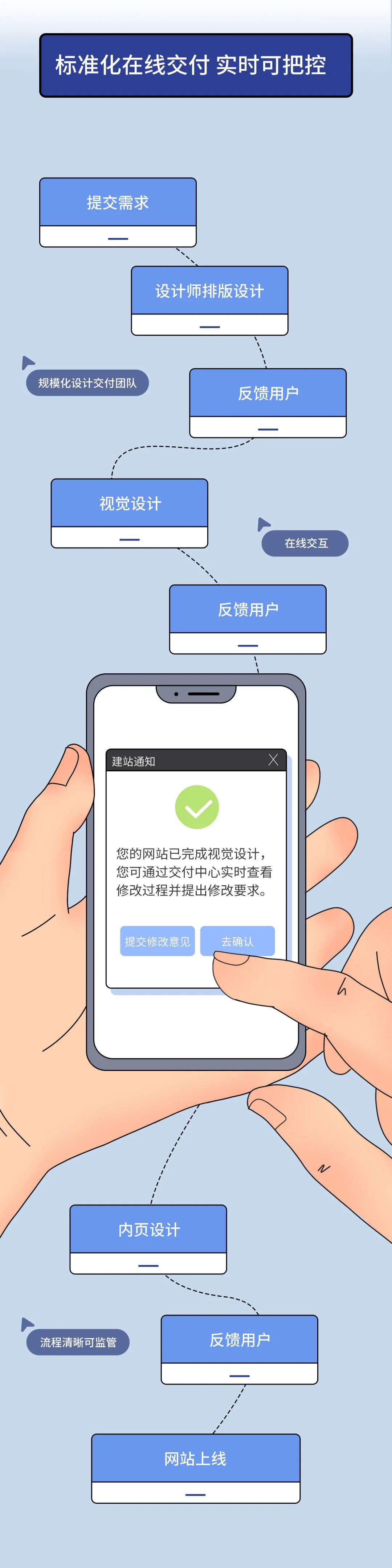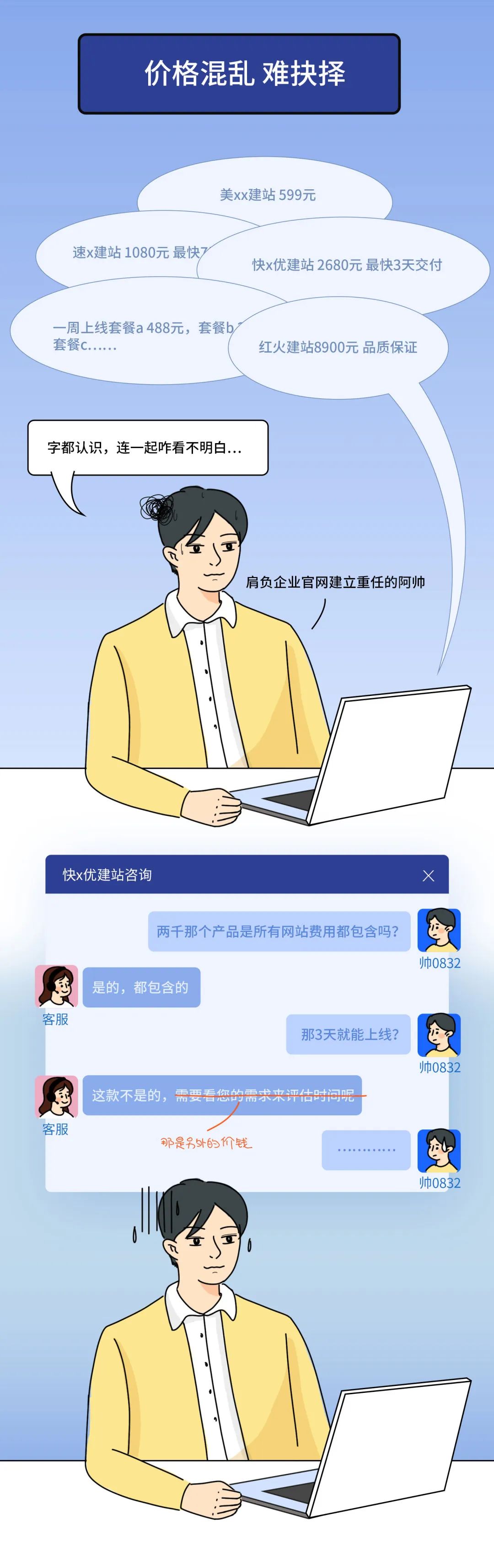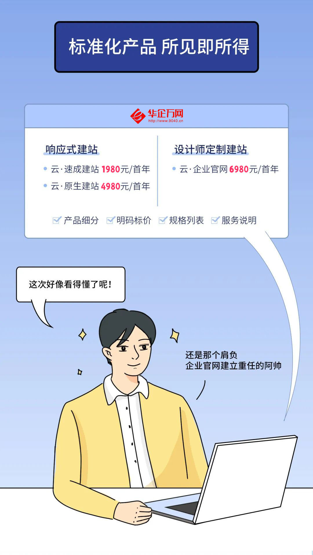 云·建站产品中所包含的功能、流程、服务都是标准的,客户可以根据自己的需求选择,价格统一透明、功能一致,拒绝“见人下菜碟”。而服务也是同样的流程,面对客户需求、提供服务、在线交付,都是标准化的。